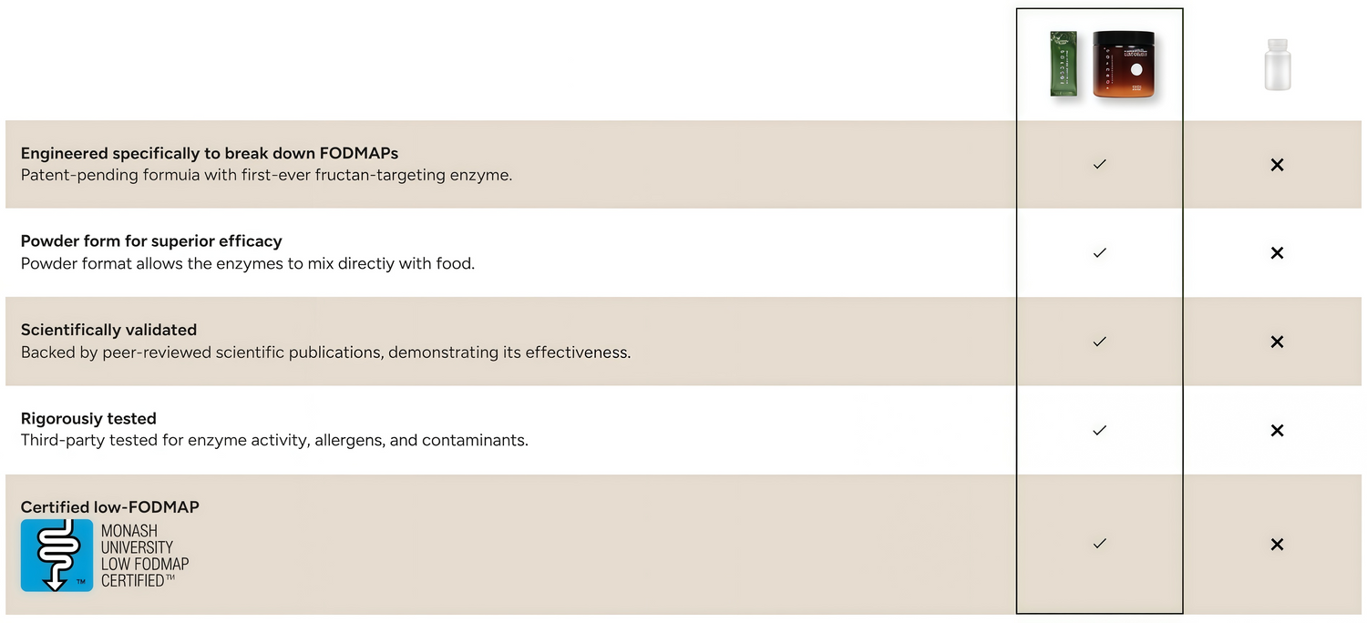 Our current formula effectively breaks down the FODMAPs fructan (e.g., garlic, onion, wheat, ...), GOS (e.g., legumes, nuts), and lactose (e.g., dairy products). We are actively developing a solution for polyols (e.g., apple, avocado, mushrooms) such as sorbitol and mannitol.